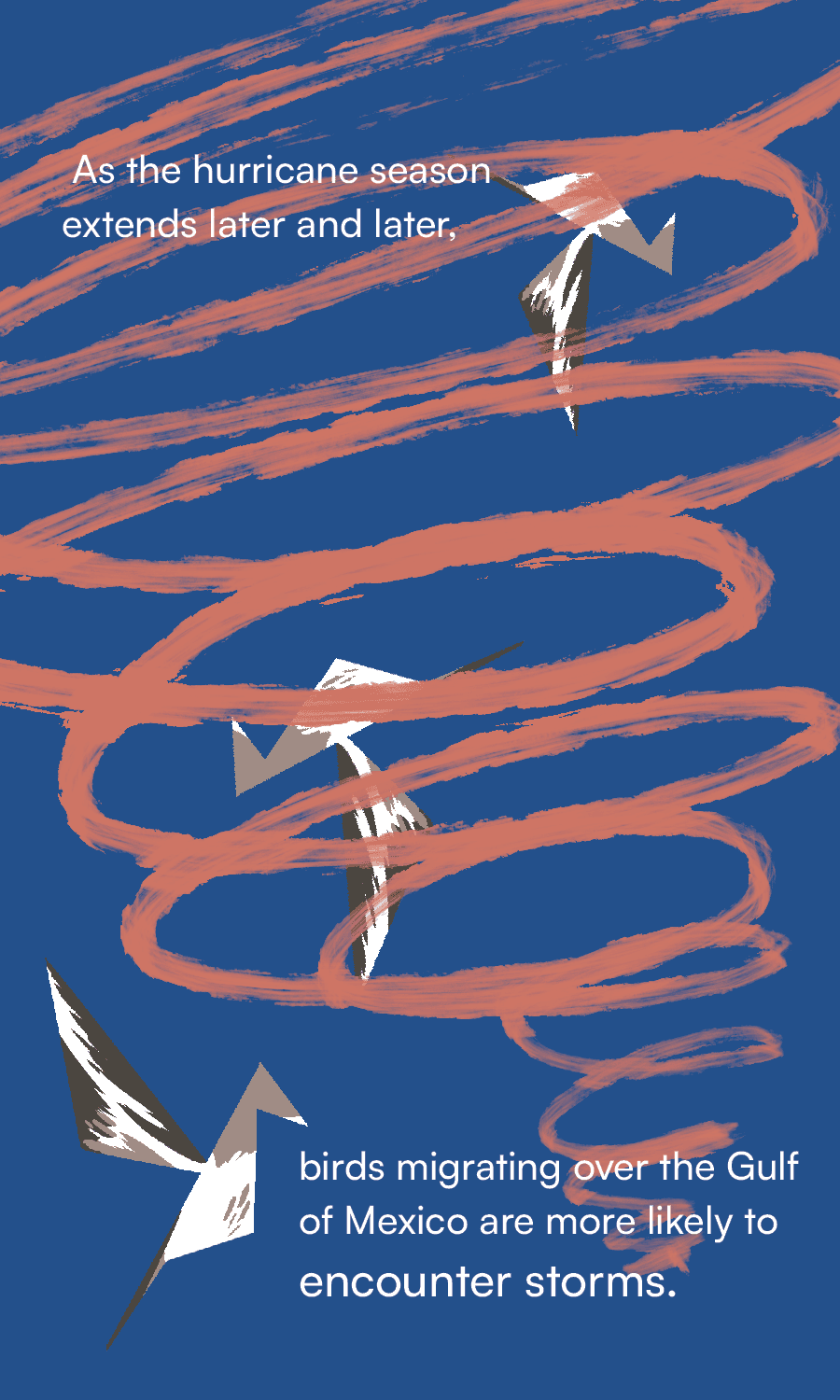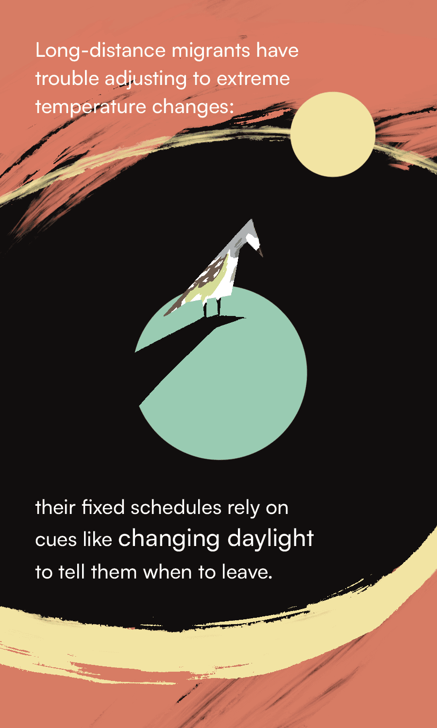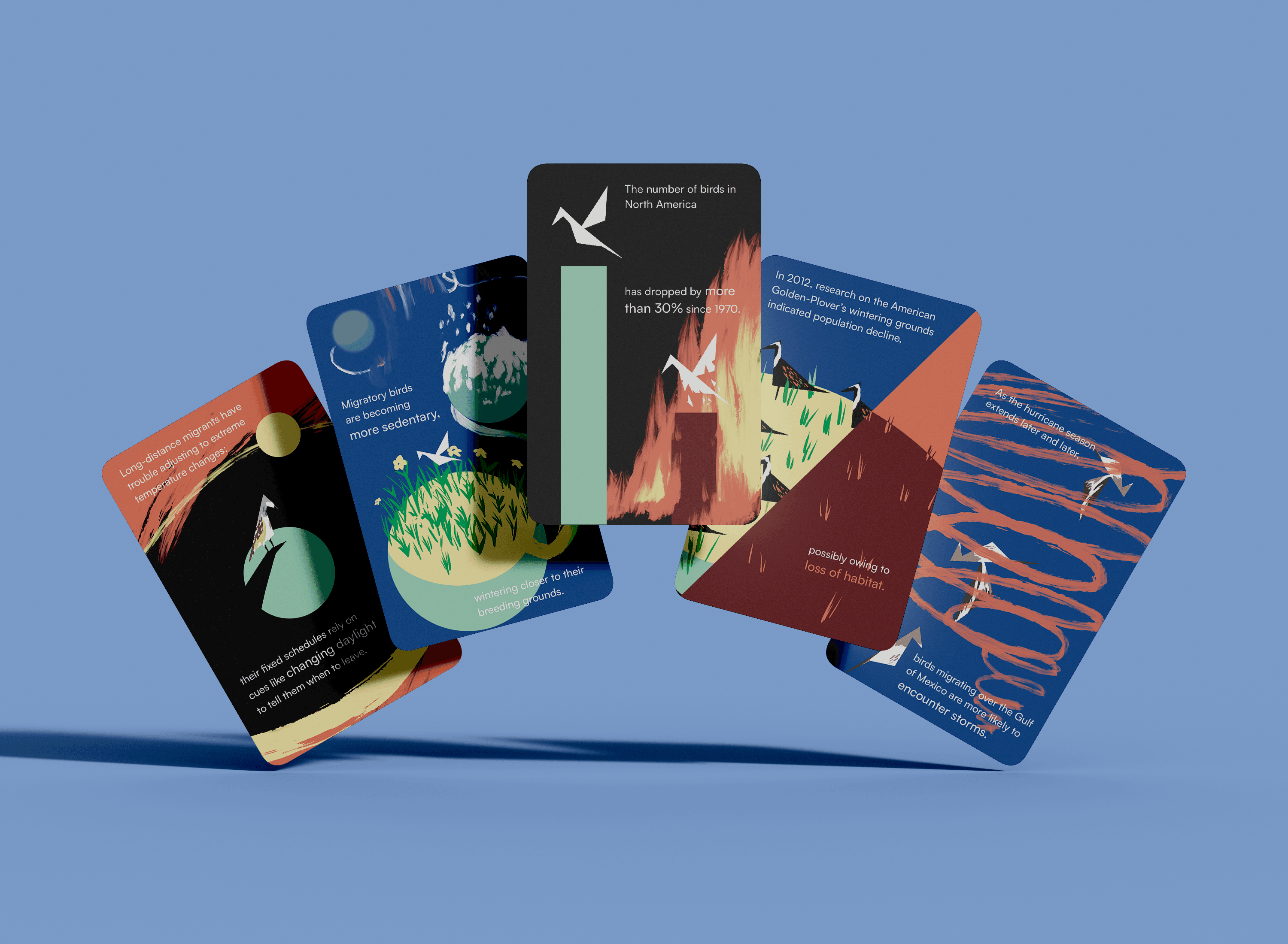 An illustrated card catalog, visualizing the issues of climate change and its disruption of North American long-distance migratory birds. Using data from various published sources*, I created 15 cards communicating various facts about the negative consequences of rising temperatures delaying these birds' migratory patterns.