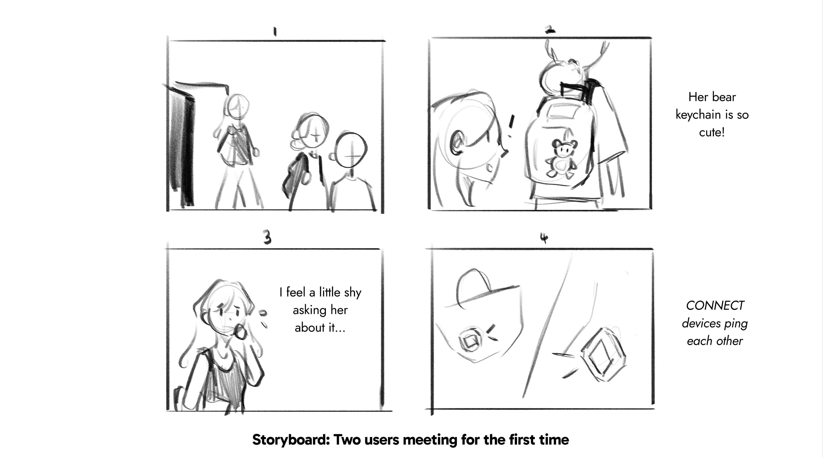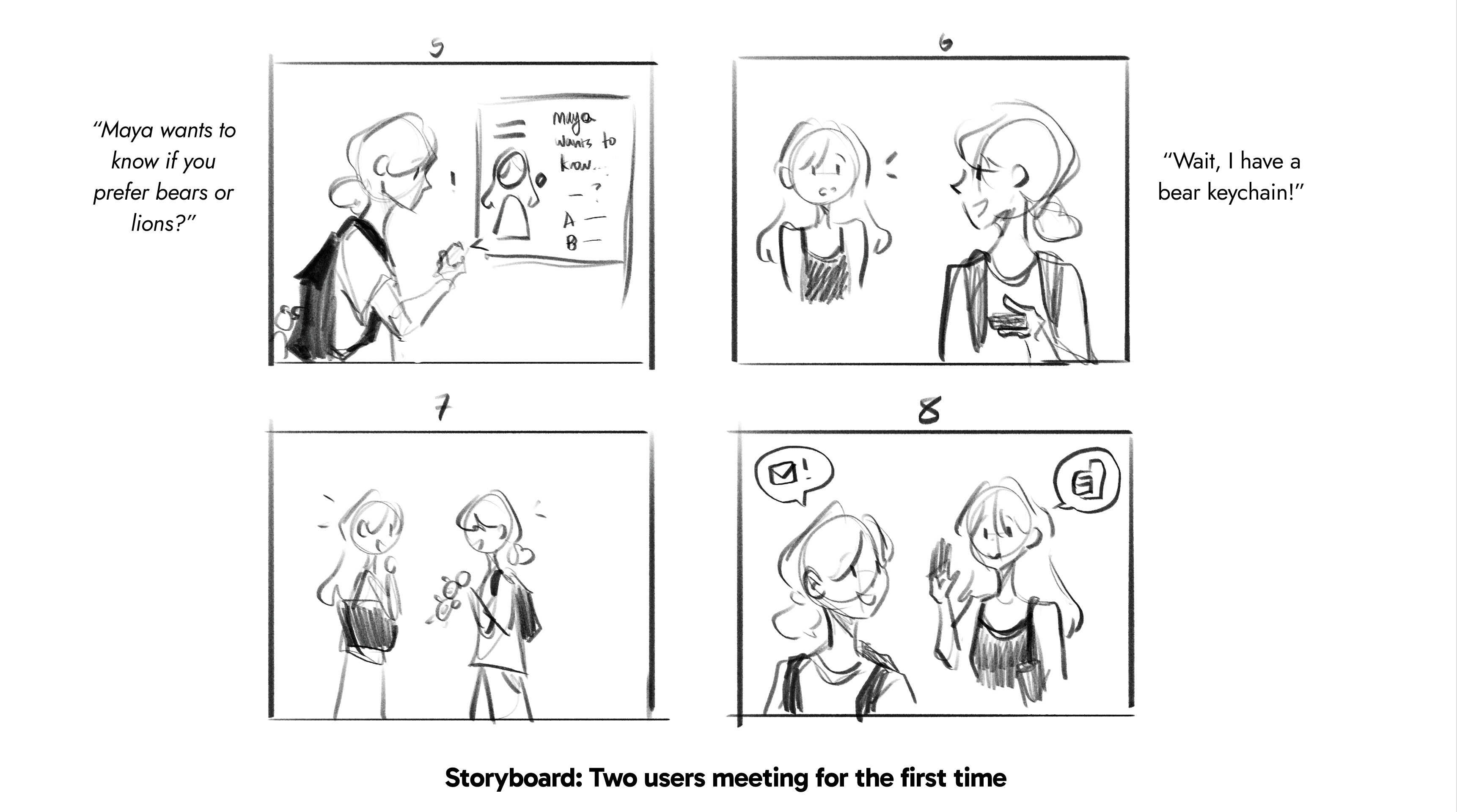 A mock-up flow of two users meeting for the first time